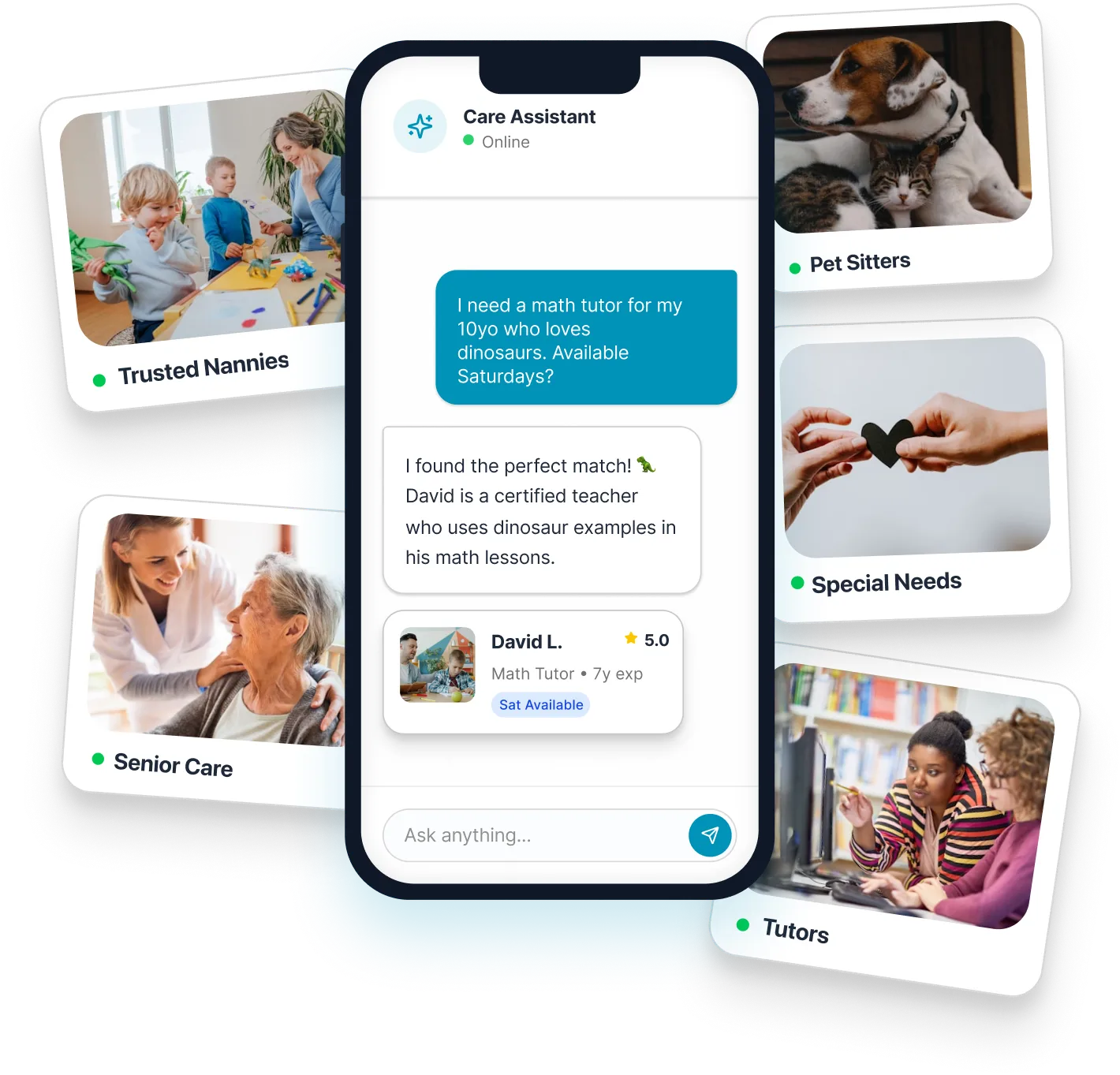 The first AI-powered platform that connects you with verified local caregivers for your kids, parents, pets, and home.